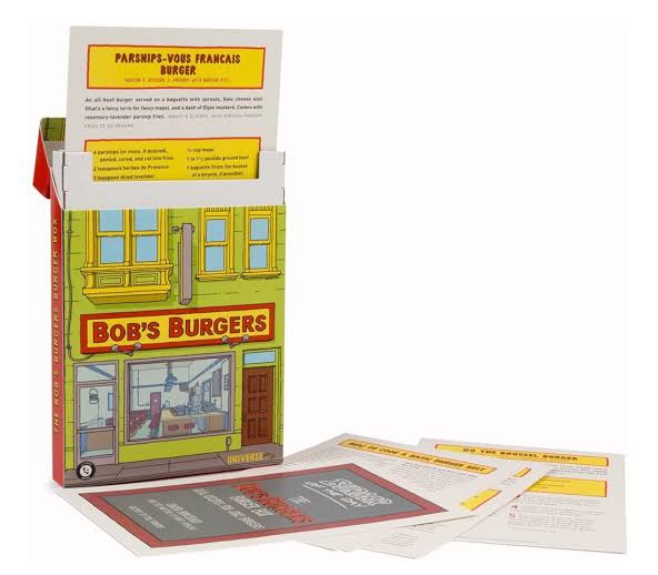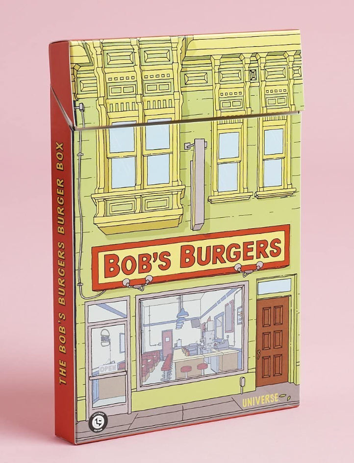 A set of recipe cards featuring the best pun-filled burger recipes from the hit TV show Bob's Burgers. The Bob's Burgers Recipe Box is a collection of thirty-five recipe cards collected from the New York Times best-selling The Bob's Burgers Burger Book. Stored in a sturdy, full-color hinged box, it is perfect for any kitchen. The recipes in this box include the Bleu is the Warmest Cheese Burger, the Bruschetta-Bout-It Burger, and the Shoot-Out at the OK-Ra Corral Burger (comes with fried okra). Serve the Sweaty Palms Burger (comes with hearts of palm) to your ultimate crush, just like Tina Belcher, or ponder modern American literature with the I Know Why the Cajun Burger Sings Burger. It also includes five blank cards to write and share your own burger recipes. Fully illustrated, The Bob's Burgers Recipe Box features the entire Belcher family as well as beloved characters including Teddy, Jimmy Pesto, Jr., and Aunt Gayle.
