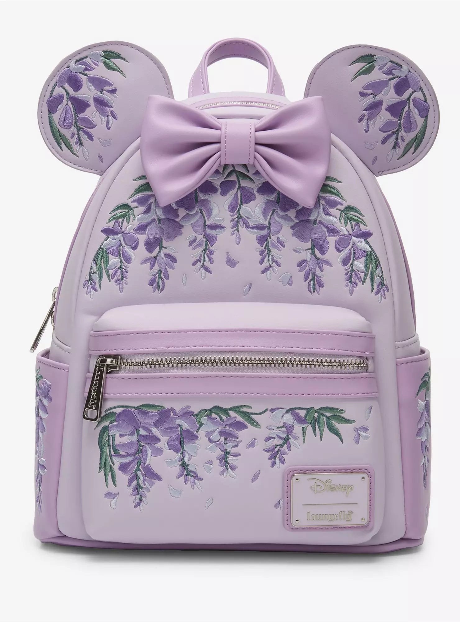 Add a floral finish to your outfits with this Loungefly mini backpack! Featuring embroidered wisteria flowers, the front also includes applique Minnie Mouse ears and a bow. With more flowers on the side pockets, this backpack is floral scented to complete the look.