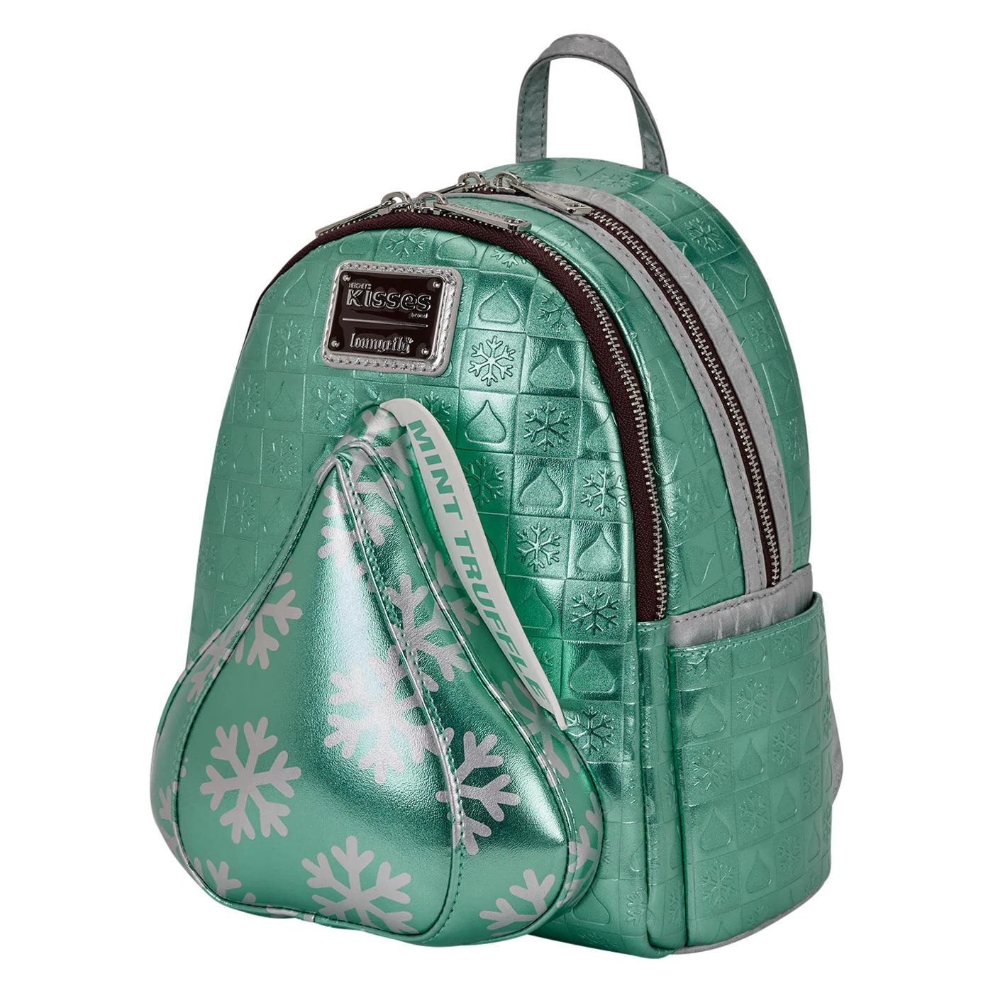 This mini backpack features a mint truffle Hershey's kiss on the front pocket, complete with metallic faux leather and silver foil. The rest of the bag features more metallic faux leather and a debossed pattern with snowflake and Hershey's Kiss symbols. Plus, for some extra fun, you'll find appliques of Hershey's Kisses on the straps!