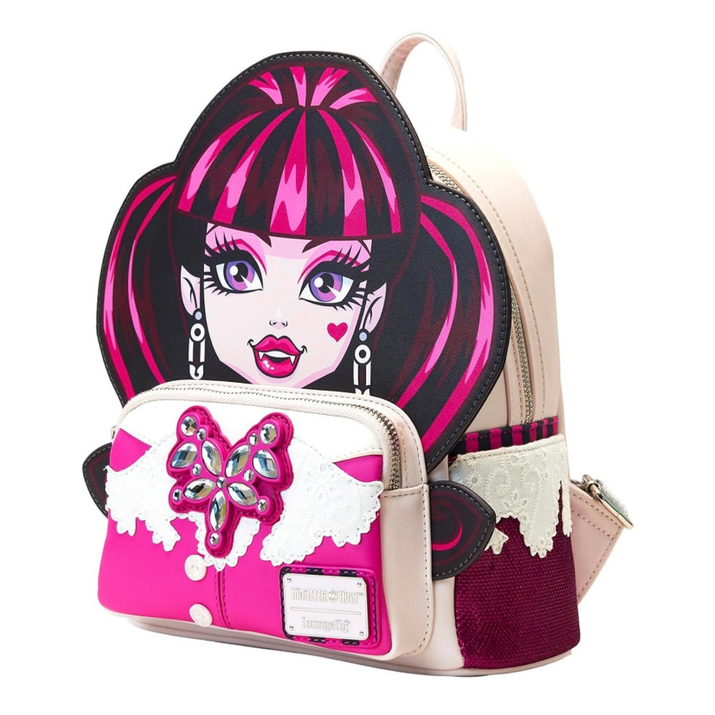 From Mattel's Monster High, this mini-backpack features Draculaura! Featuring incredible detail to bring Draculaura to life, this Loungefly mini-backpack is made of vegan leather (polyurethane), has a front zipper compartment, side pockets, and adjustable back straps. Inside, the backpack continues the theme with unique, coordinating lining. Bring home a piece of Monster High today! "THIS ITEM IS NOT INTENDED FOR USE BY CHILDREN 12 AND UNDER"