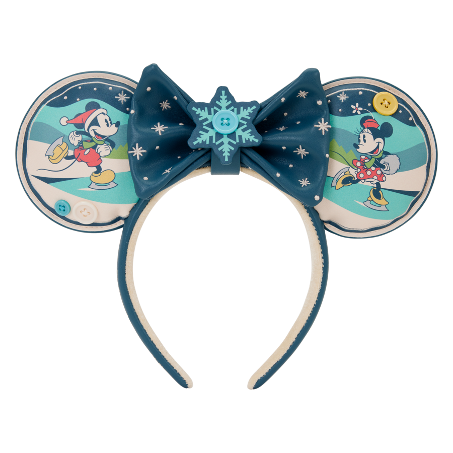 This ear headband features Mickey and Minnie ice skating. You'll find a removable bow between the ears, featuring a snowflake charm in the center and stars on the bow. Turn it around to find a quilted pattern on the back of the ears featuring evergreen trees.