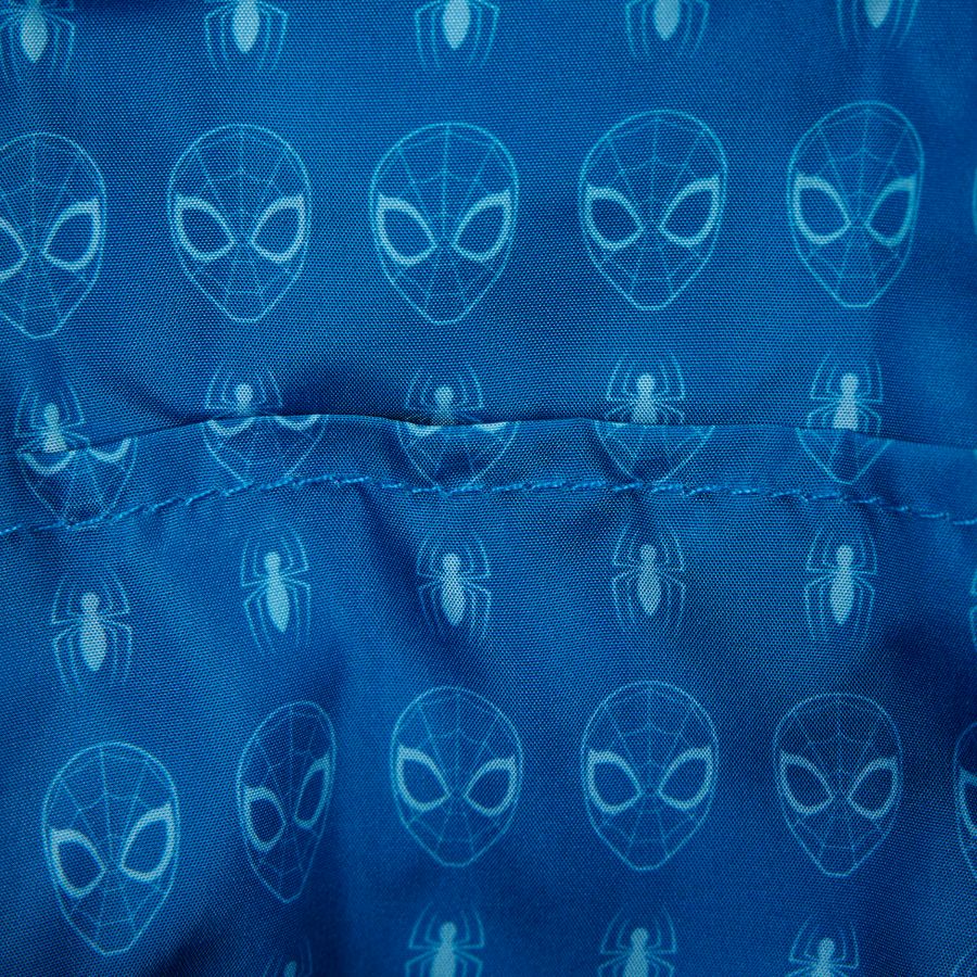 This crossbody bag has a sherpa front pocket that features Spider-Man's mask. The second compartment behind it features various symbols of Spider-Man within squares that look stitched together. A detachable coin bag is attached to the crossbody strap, and it features Spider-Man's mask!
