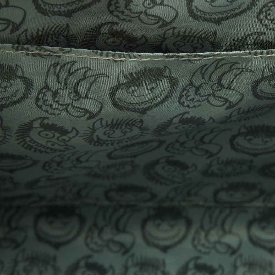 You'll find Max and the Wild Things climbing through the trees together on the front flap. Below, you'll find artwork of the forest. The back of the bag features textured faux leather. Along the strap, you'll find images of the Wild Things!