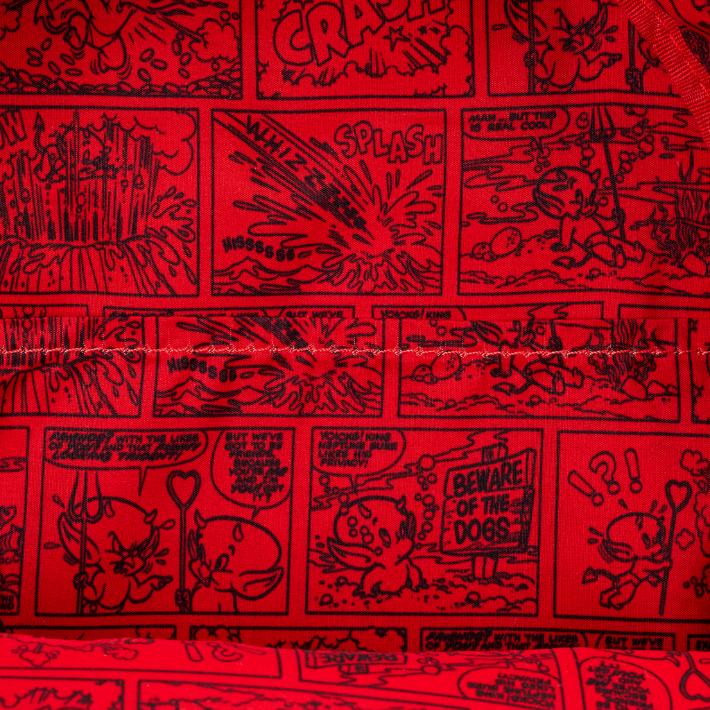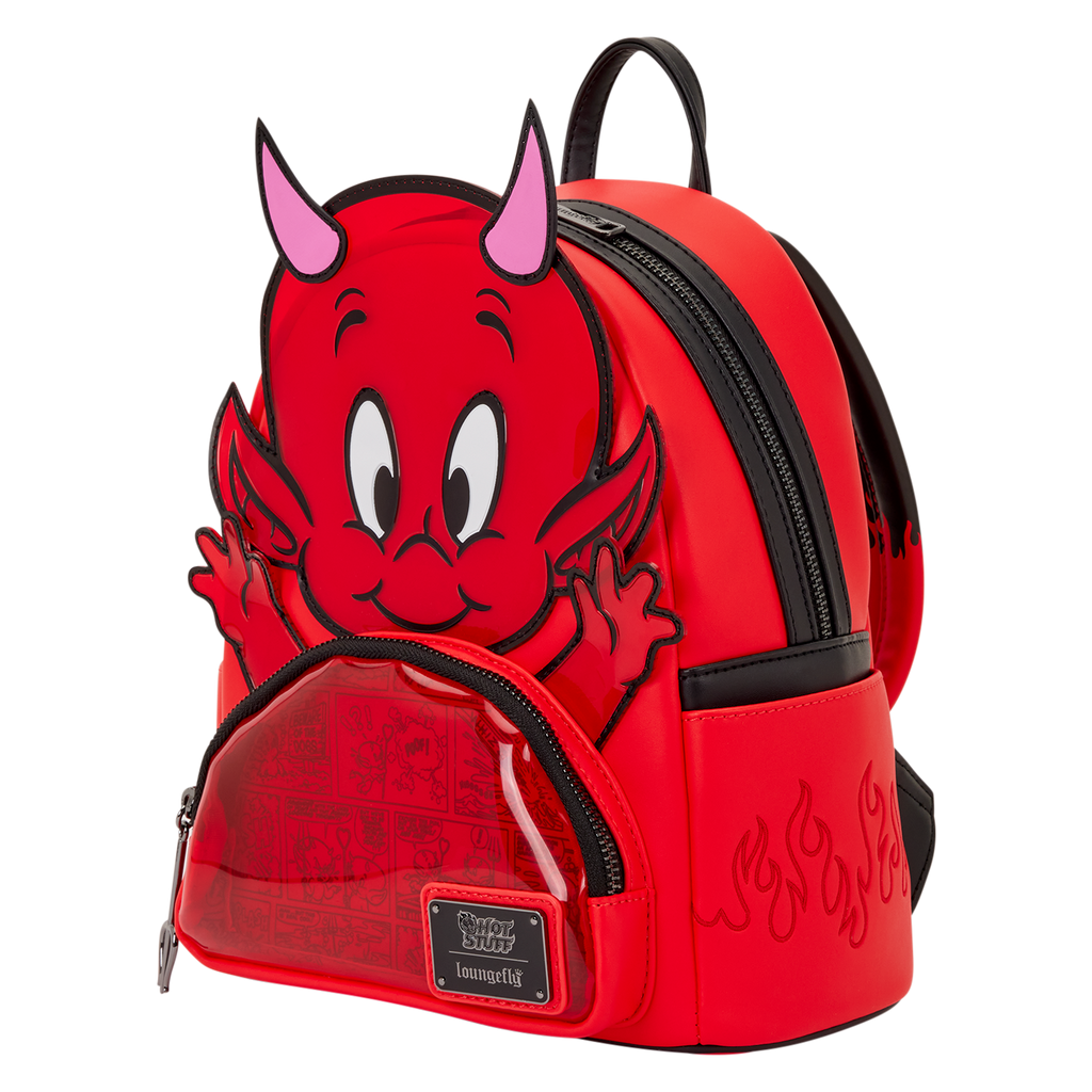This mini backpack is inspired by Hot Stuff, the Little Devil from Casper the Friendly Ghost. He takes shape on the front of the bag with frosted transparent PVC and debossed details. You'll find a pitchfork charm as the zipper pull on the front pocket. Embroidered flames are on the side pockets. More flames appear on the straps, and you can find a heart with devil horns and a tail on the back that says "Hot Stuff."