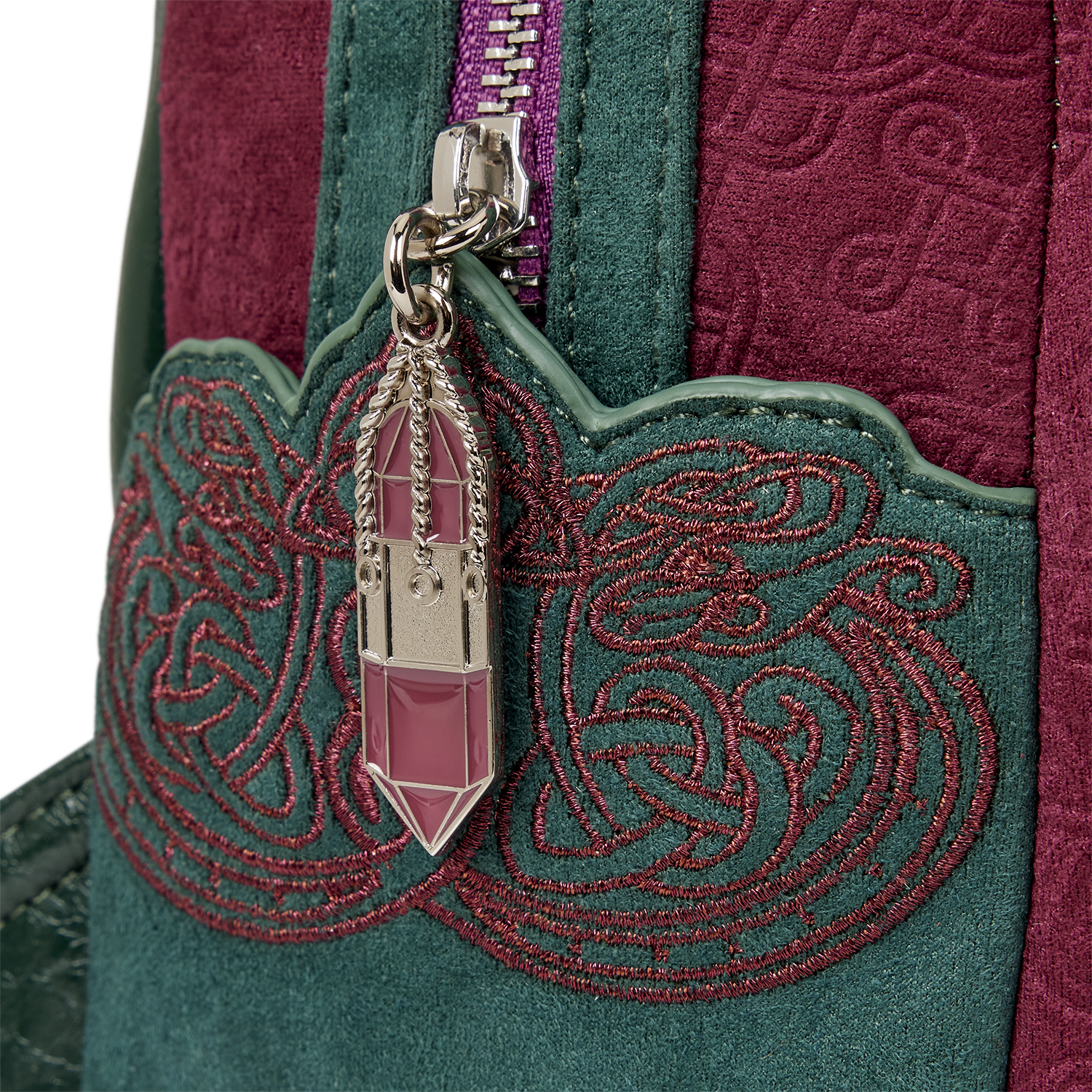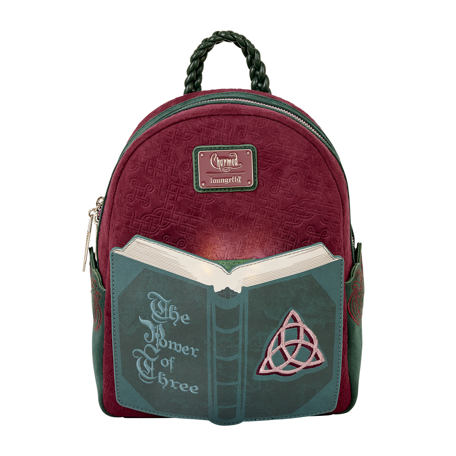 This bag features the Book of Shadows on the front with an embroidered triquetra on the front cover. The book lights up! You'll find more designs in foil on the sides and an enamel zipper charm in the shape of a crystal!