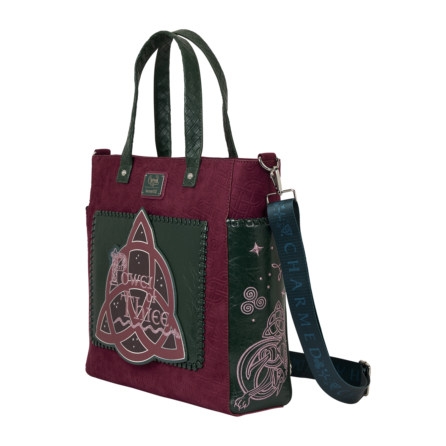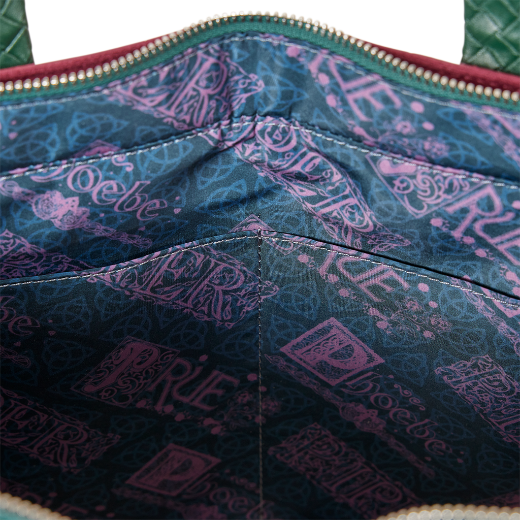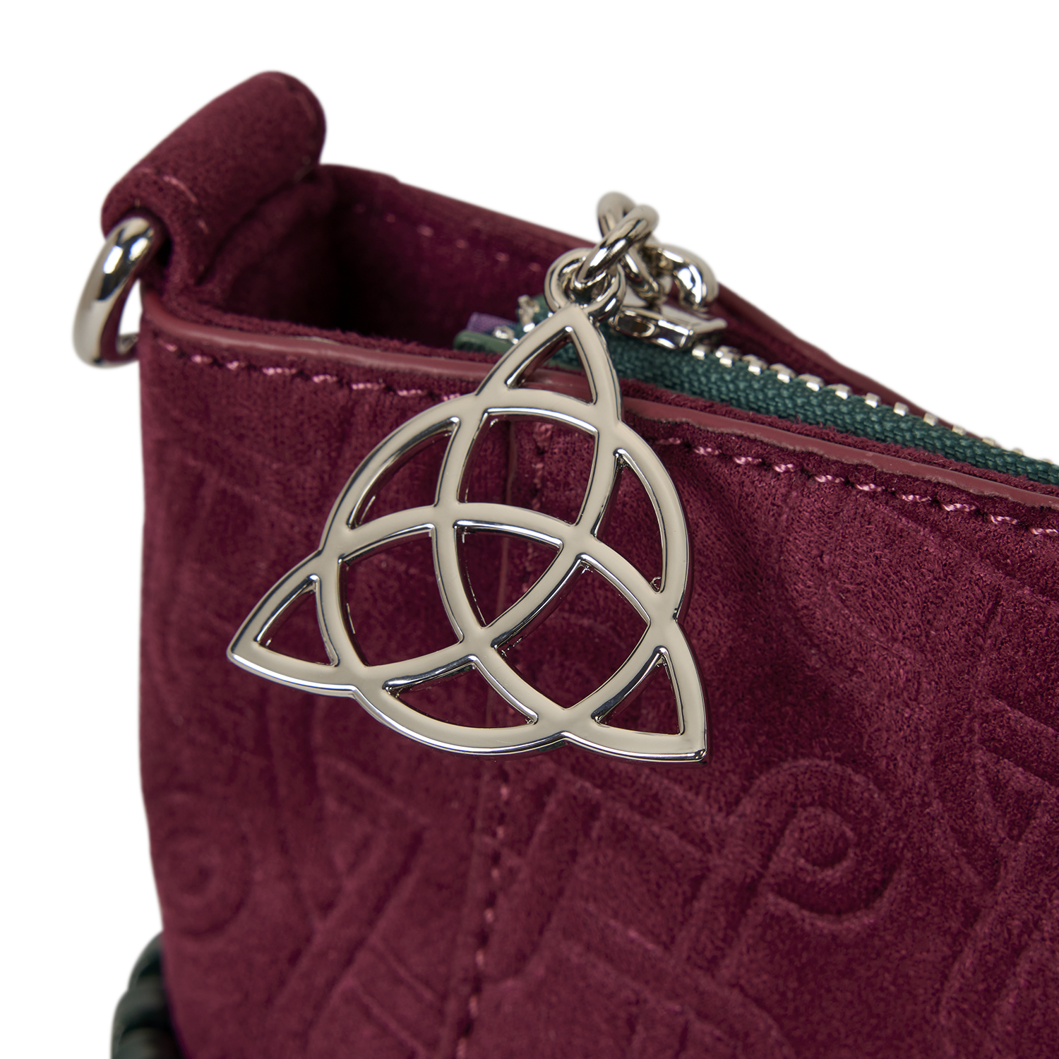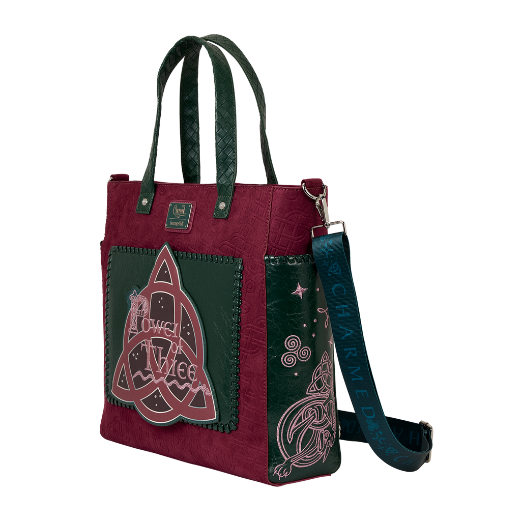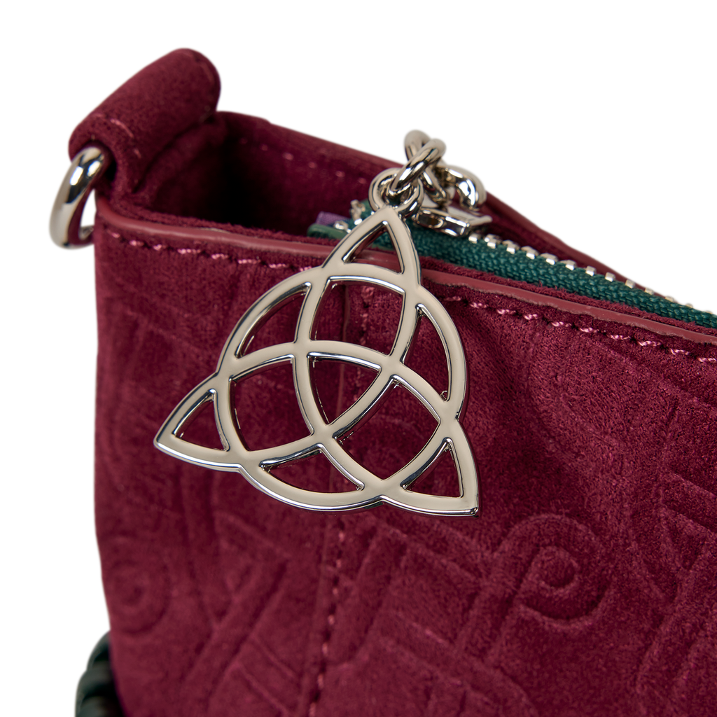 You'll find the triquetra symbol front and center on this bag, with ""Power of Three"" written over it. Metallic embroidery, foil details, and faux suede make this bag a powerful fashion statement.