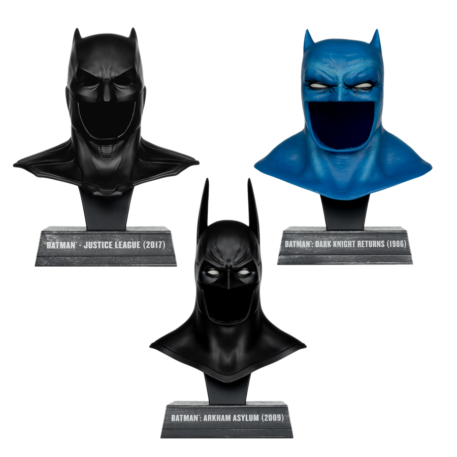 The DC Prop Replica Wave 3 features all your favorite Batman cowls shrunken down into 1:3 scale for easy display anywhere in your collection! Each mask comes with a display pedestal and measure about 8-inches tall.