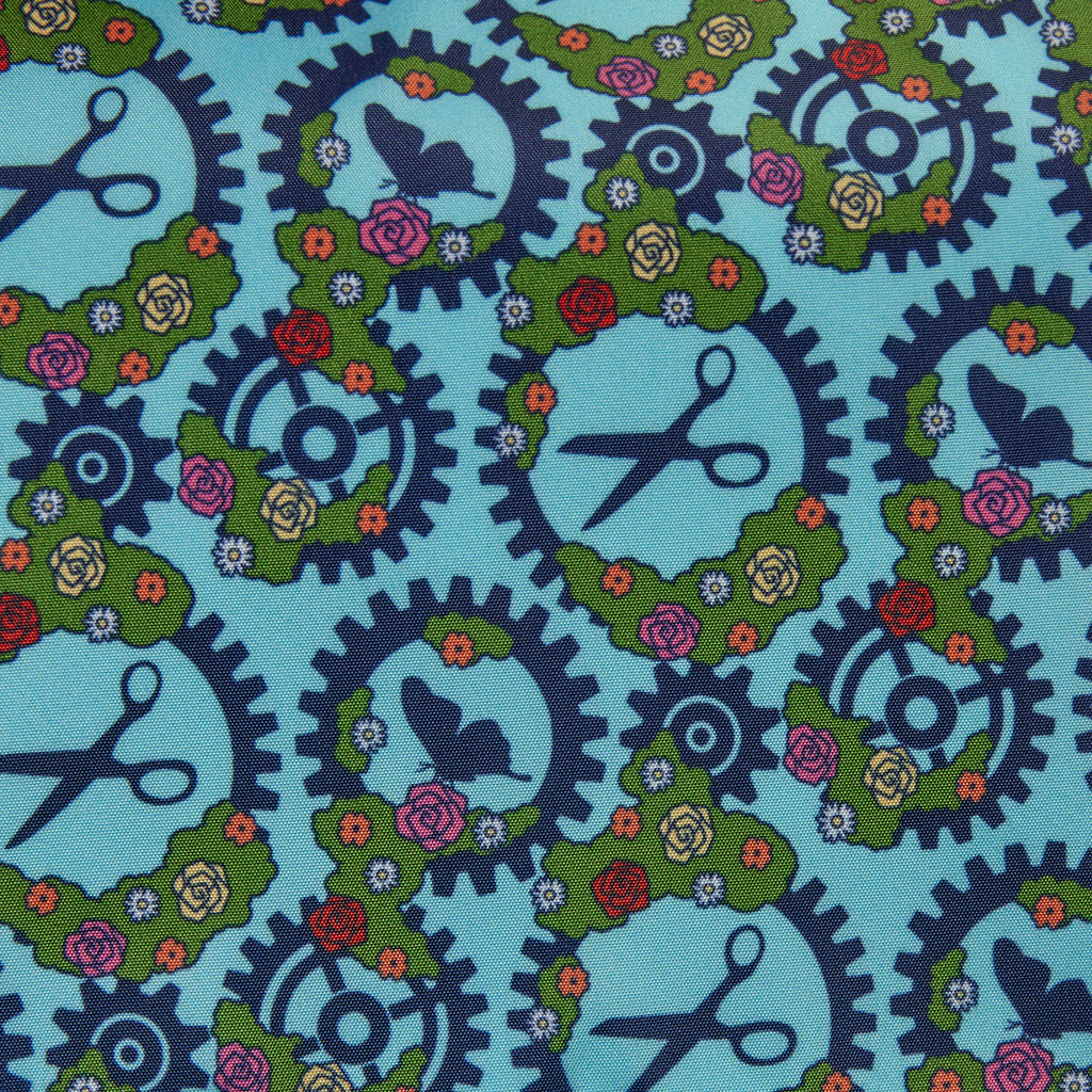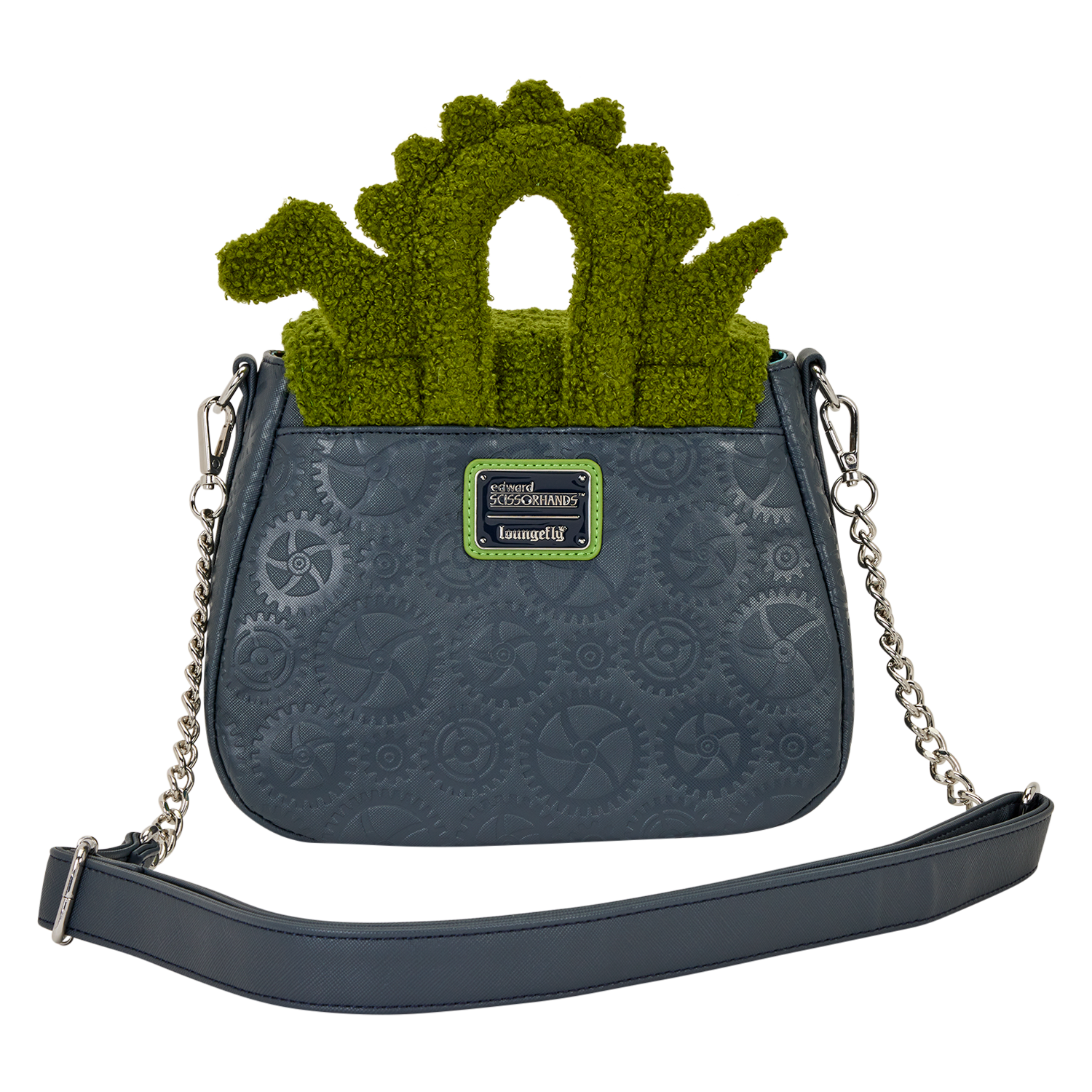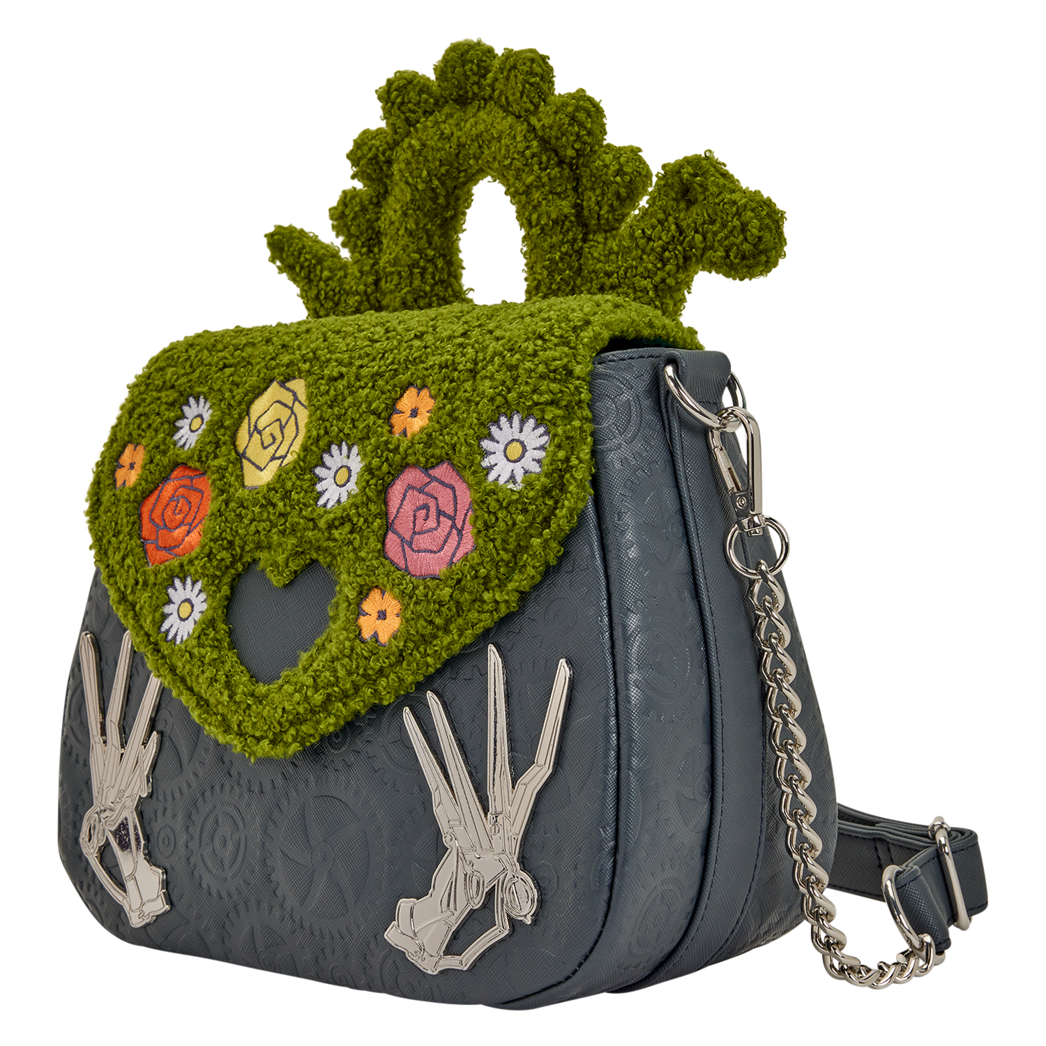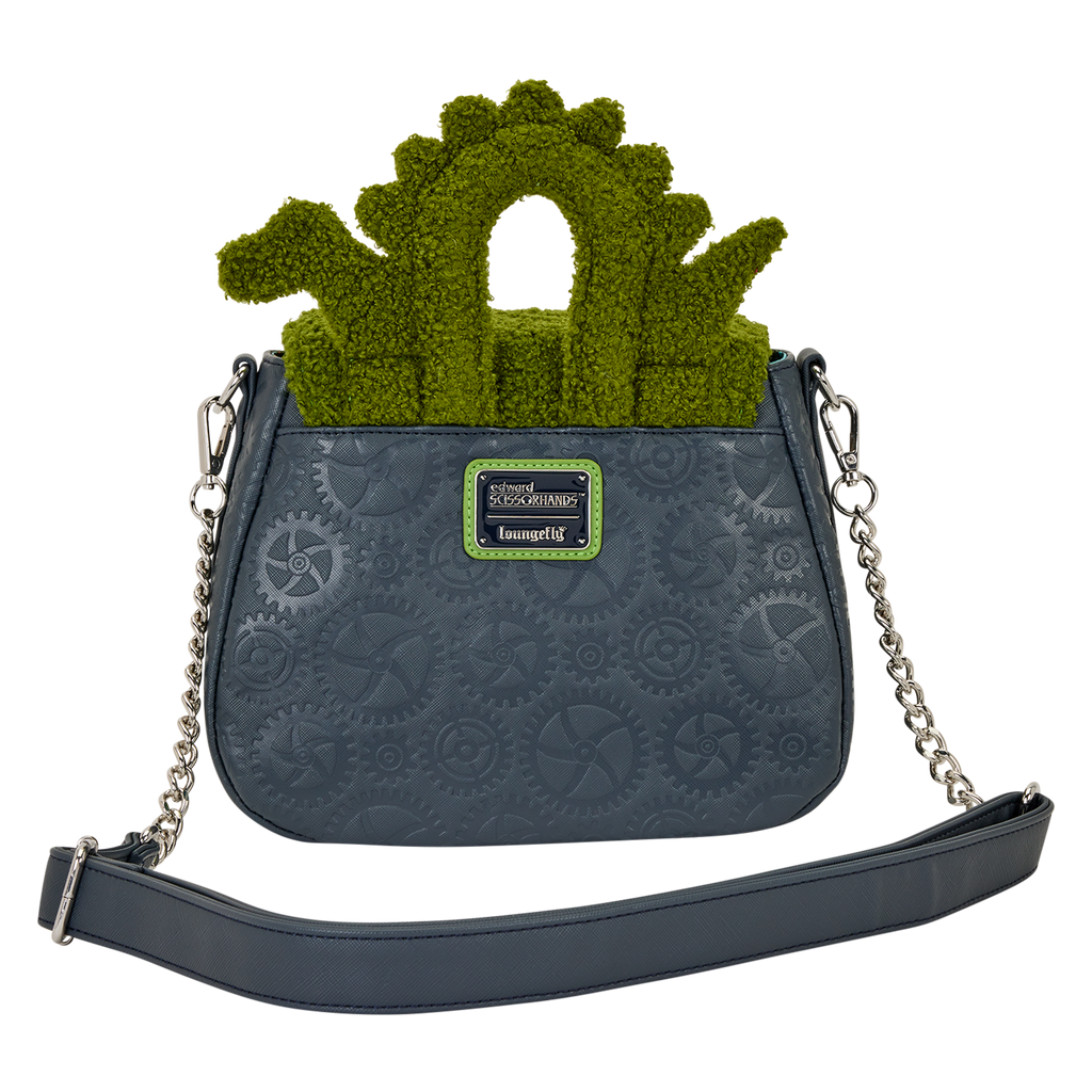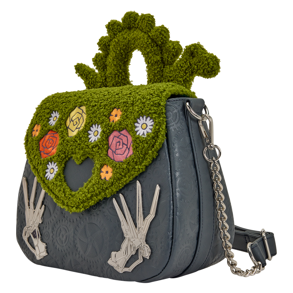 This crossbody bag features sherpa details modeling a hedge. It covers the front flap and there's a padded applique in the shape of a serpent. Embroidered roses cover the front flap and there's a heart-shaped cutout in the center. In the bottom corners, you'll find molded metal charms of Edward's scissor hands. A debossed pattern of gears against saffiano faux leather brings the whole look together.