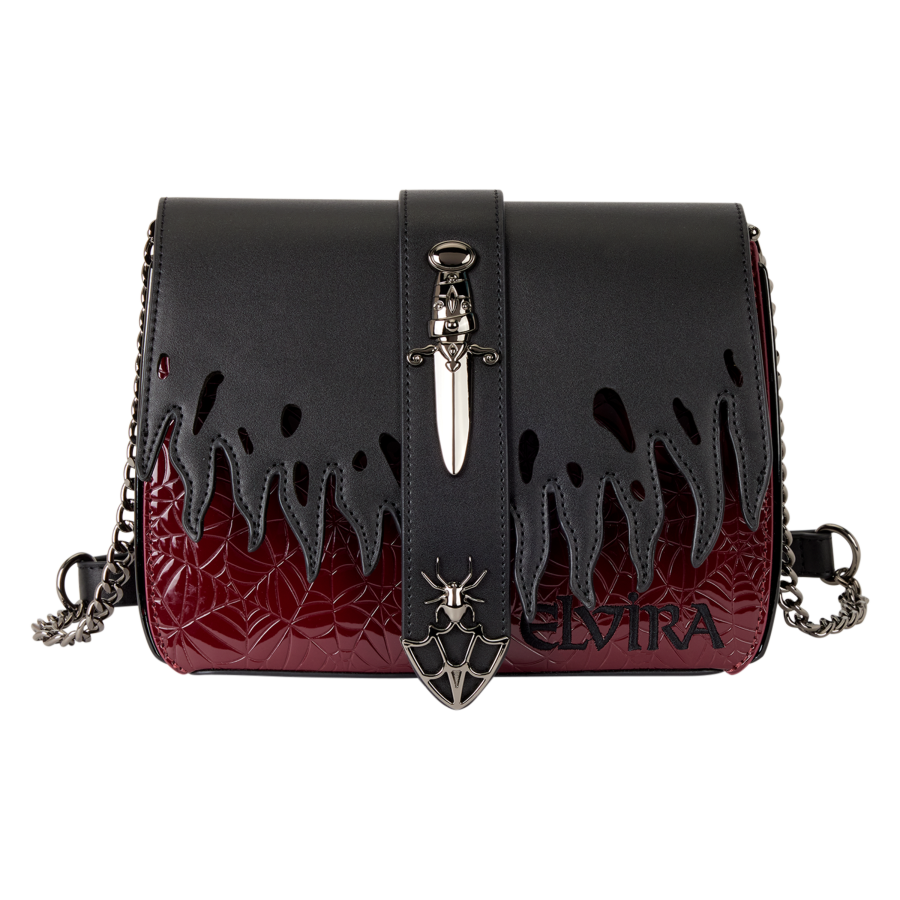 This faux leather crossbody features red flames that have debossed spider webs within it. You'll find embroidery of spiders and Elvira's name on the front and back of the bag. A black strap extends down the front, featuring a molded metal charm of a dagger and a spider!