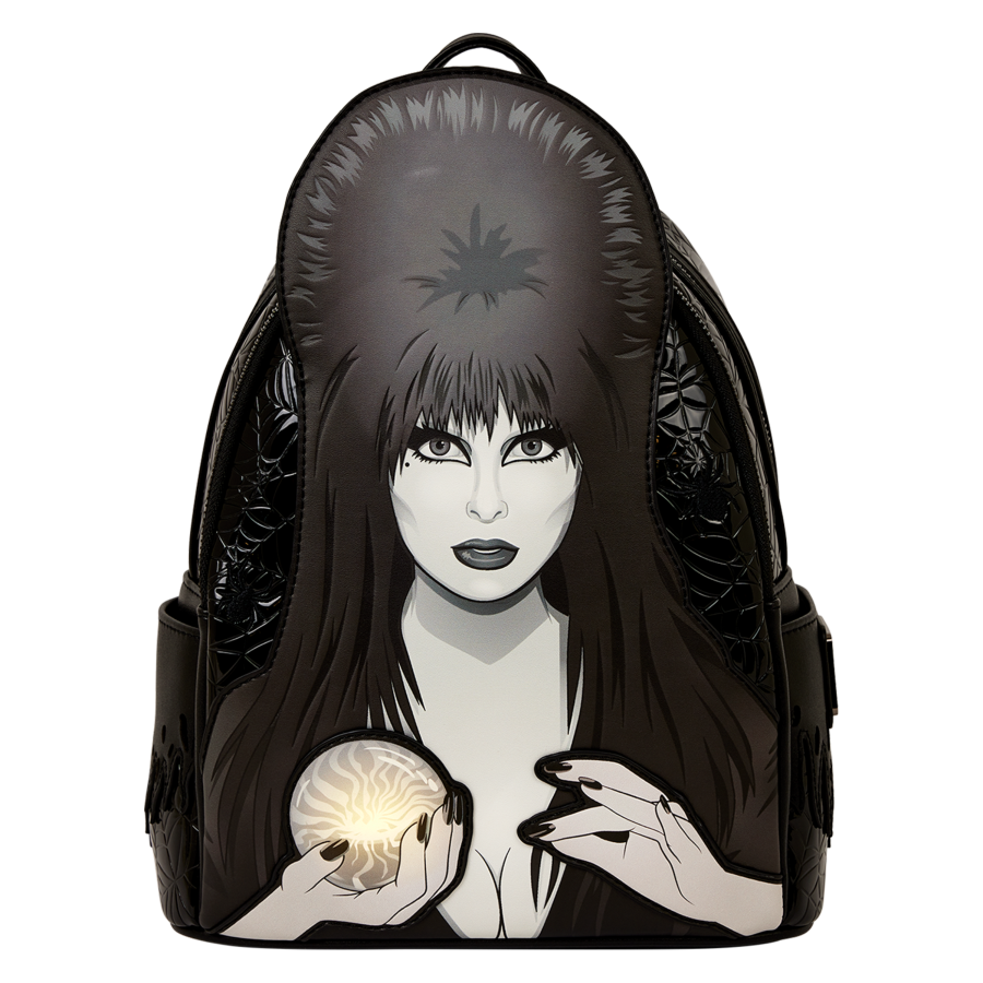 This mini backpack features an applique of Elvira on the front holding a crystal ball that lights up! Behind her on the rest of the bag is a debossed pattern of spider webs. You'll also find embroidered spiders! Take a look at the straps to find appliques of a spider and a dagger.