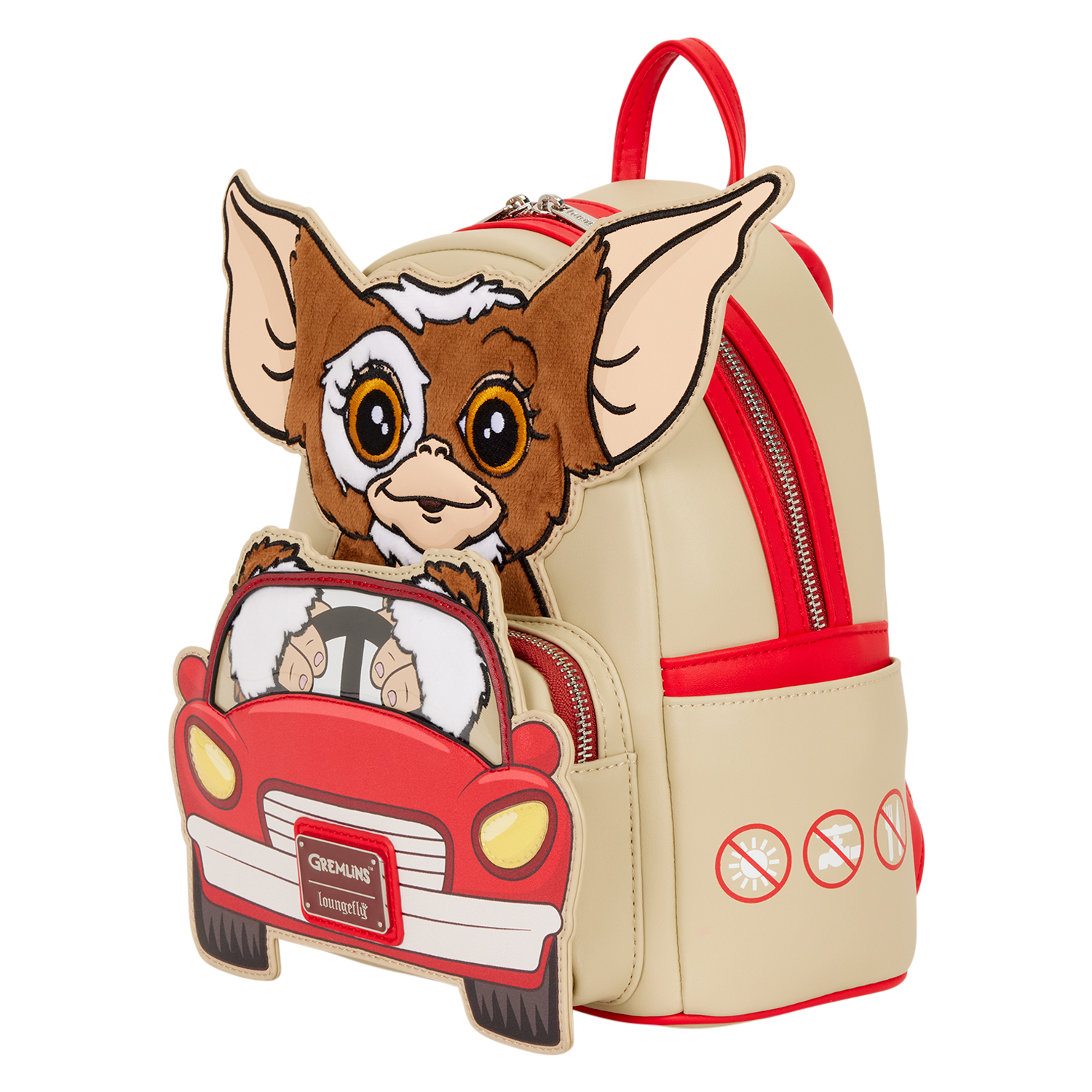 This mini backpack features Gizmo front and center with plush and embroidered details. Gizmo drives a car that doubles as the front pocket – and you know what's really cool? The headlights light up! You'll find "Handle with Care" written on one of the side pockets, and red straps bring the whole look together!