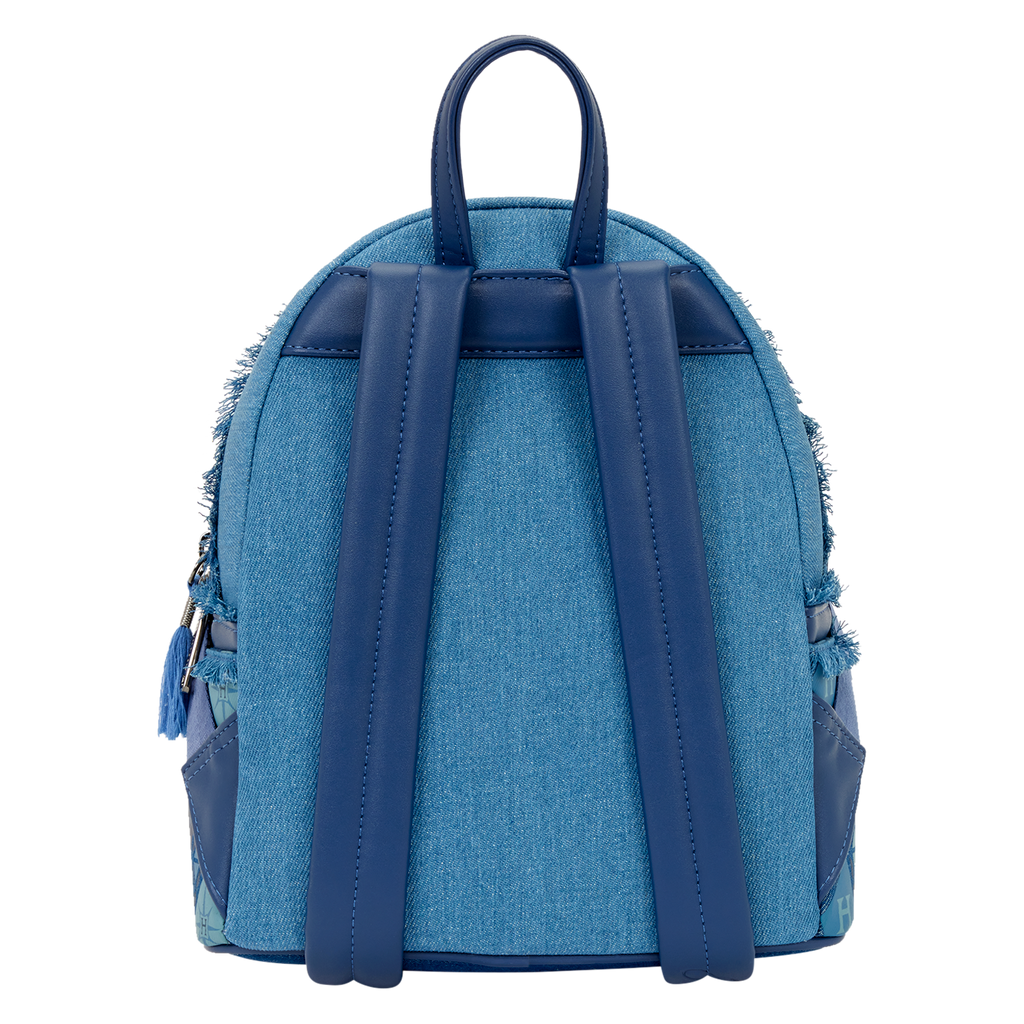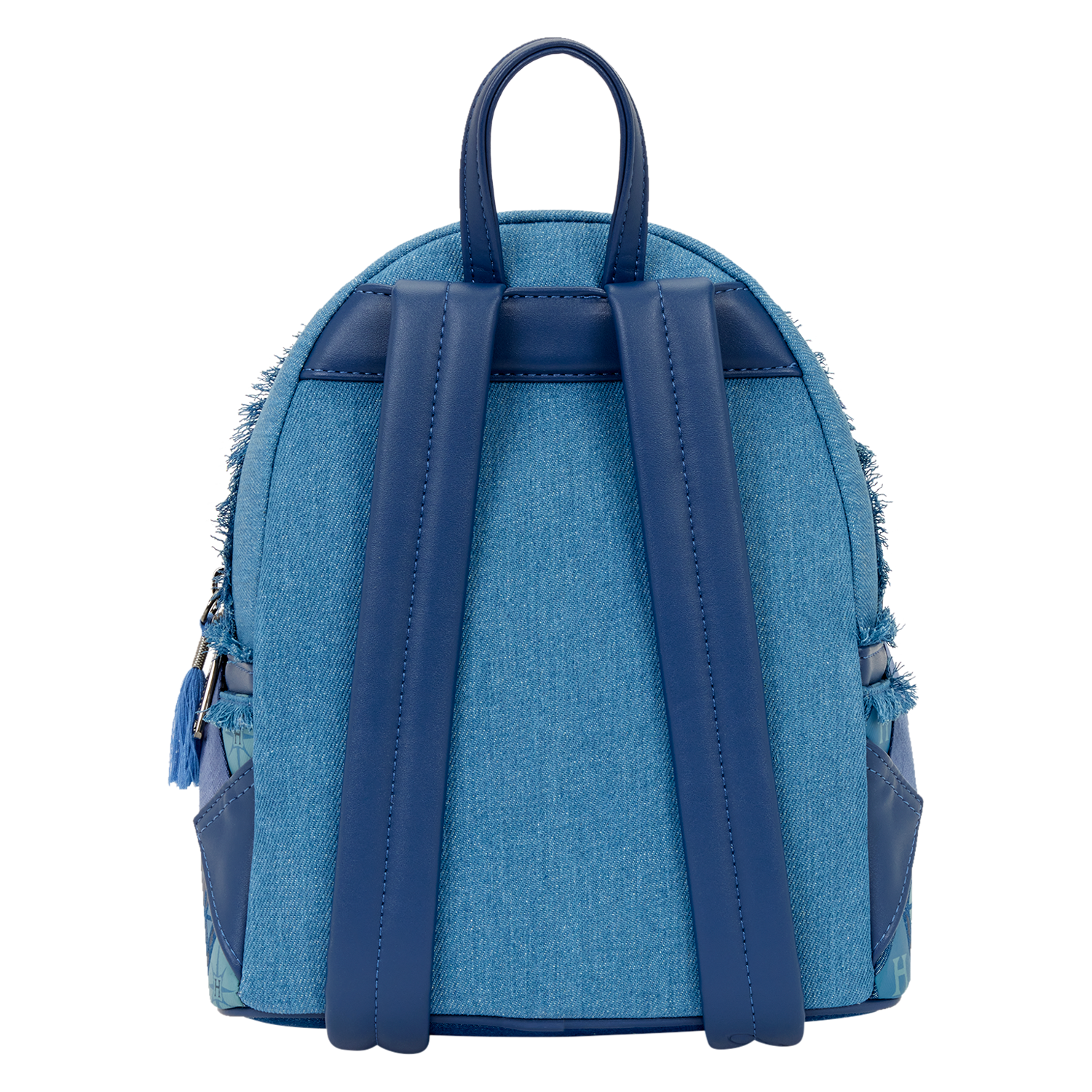 This mini backpack features faux denim, metal charms, and fringe. On the front pocket, you'll find the Hogwarts crest with symbols of each house. The bottom of the front pocket and side pockets feature an all-blue argyle-type pattern, which includes the Hogwarts "H" symbol. Turn it around to find "Harry Potter" debossed on one of the straps.