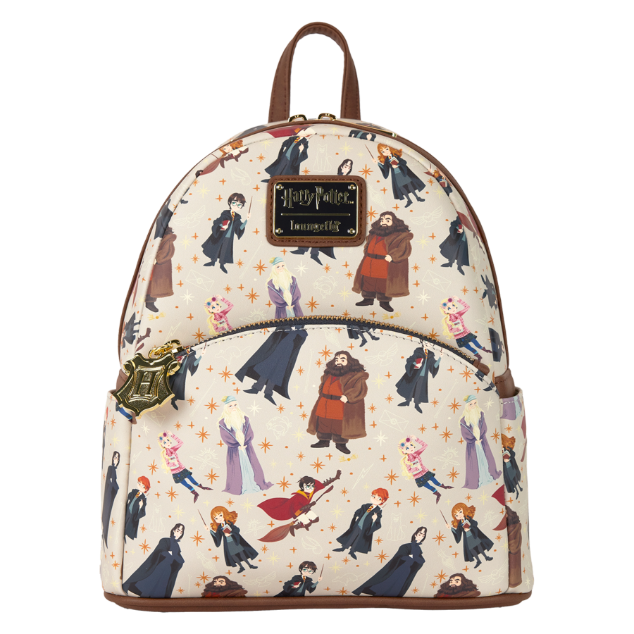 Enchant the halls with this Harry Potter mini backpack, featuring an all-over print of Rubeus Hagrid, Severus Snape, Albus Dumbledore, Harry Potter, Hermione Granger, Ron Weasley, and Luna Lovegood. A flicker of golden "sparkles" surrounds them, indicating an allusion to magic. Store smaller, treasured items on your journeys in the front pocket, topped off by a molded metal charm of the Hogwarts emblem. There's just enough room for packing your daily essentials and setting off on magical journeys in style.