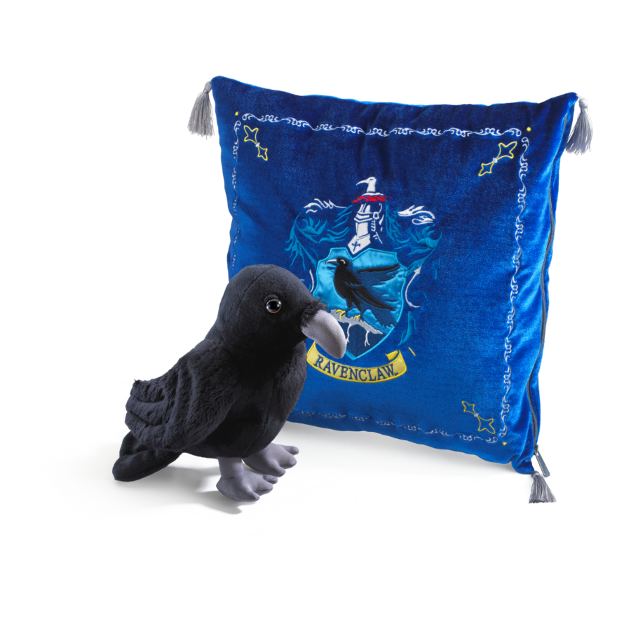 Measuring approximately 34cms square, this embroidered Ravenclaw house crest cushion contains a plush of the Ravenclaw raven mascot as featured in the Harry Potter films.