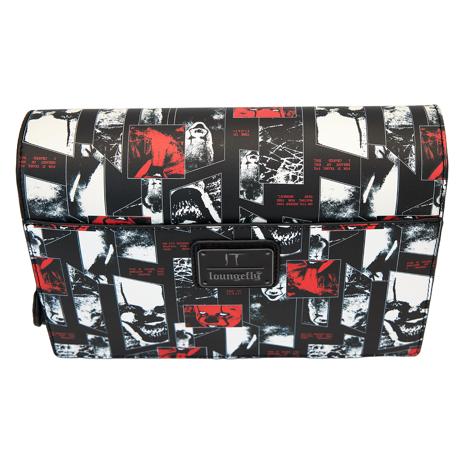 A jagged, die-cut front flap gives the look a fashionably sharp edge, and a vegan leather charm of Pennywise's face, in red, tops off the look.