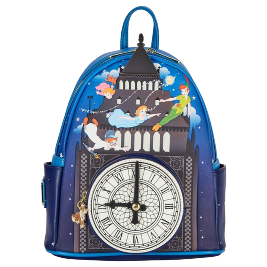 Tink's pixie dust has set the wheels in motion. Peter Pan will whisk the Darling children away to Never Land. Hang on tight to witness this scene up close with this Loungefly Peter Pan Clock Glow in the Dark Mini Backpack.