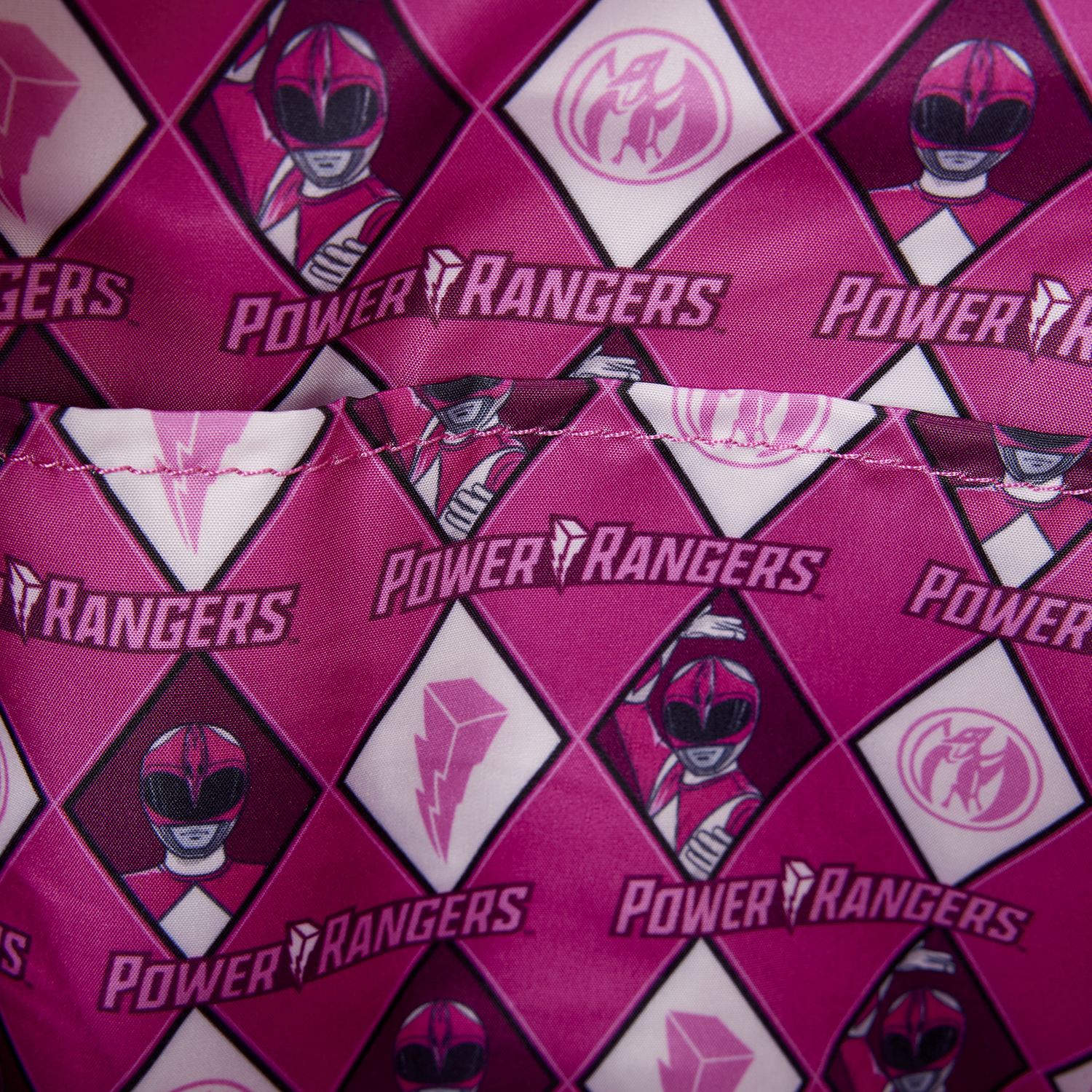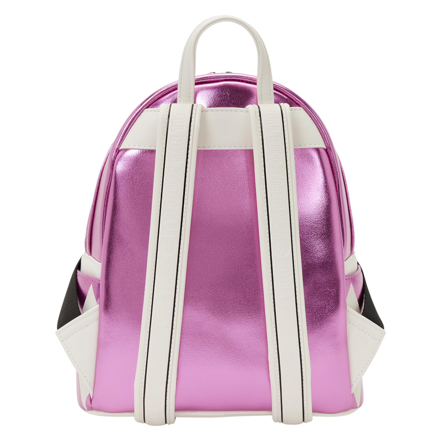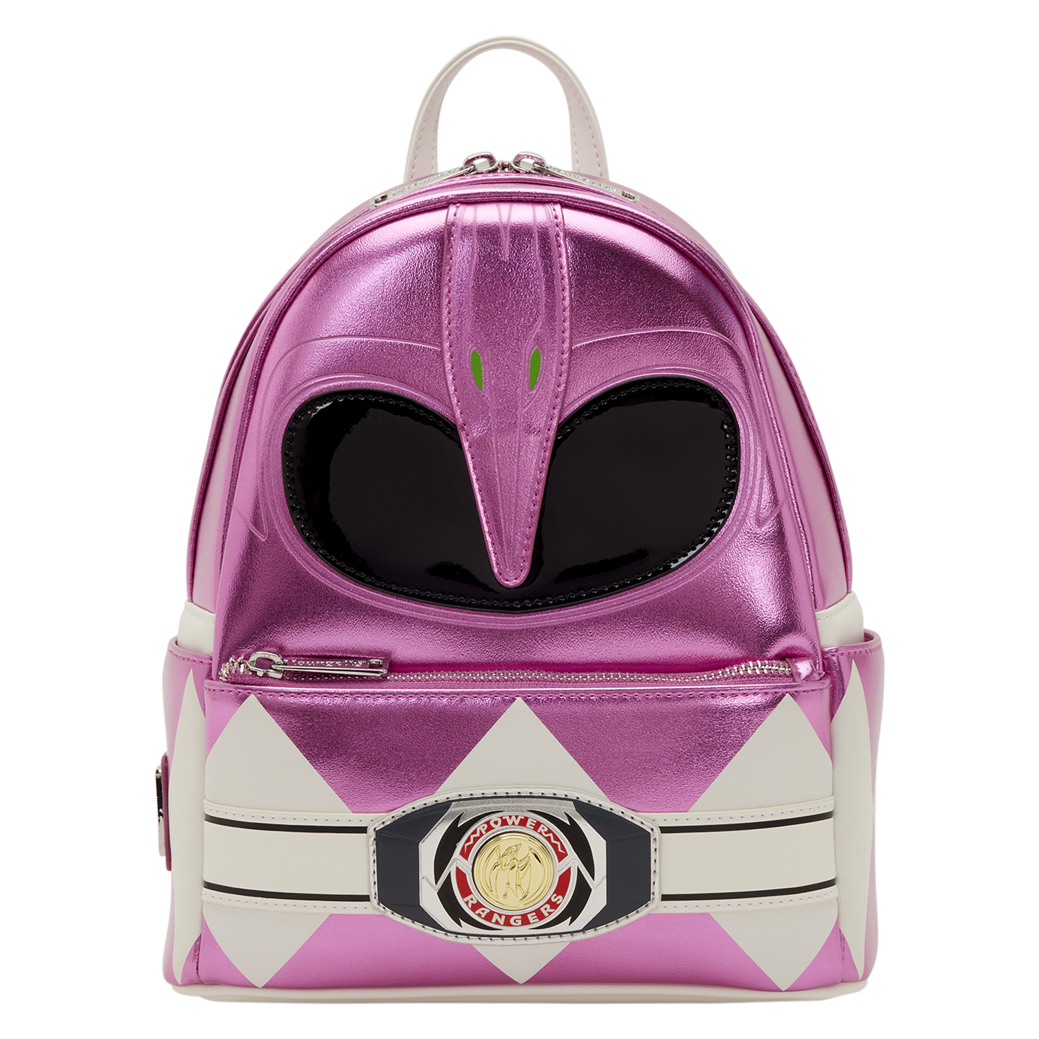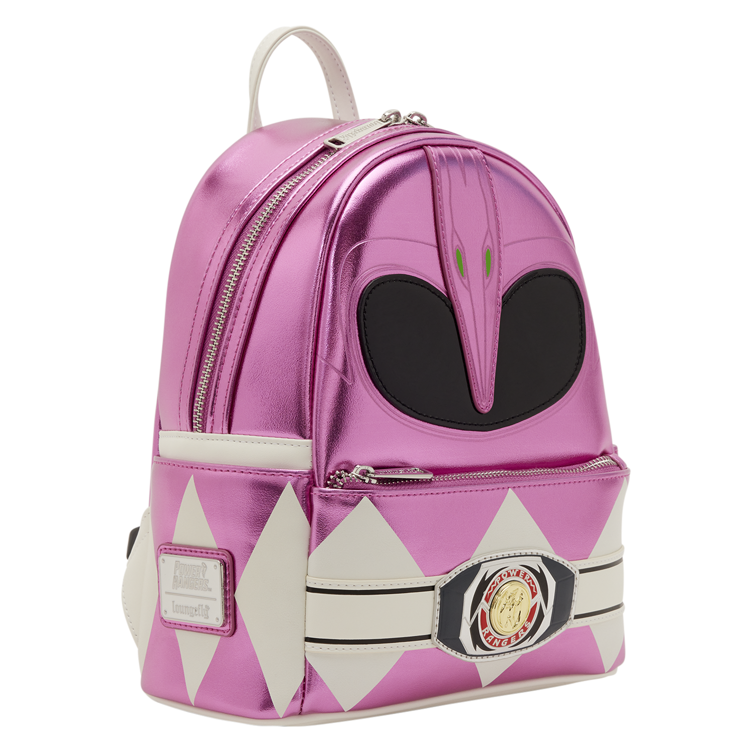 This bag is inspired by the Pink Ranger. Metallic, debossed, and padded applique details bring the uniform of the Pink Ranger to life! You'll even find a molded metal charm of the belt across the front pocket. Take a close look at the straps and find "It's Morphin Time" written along them!