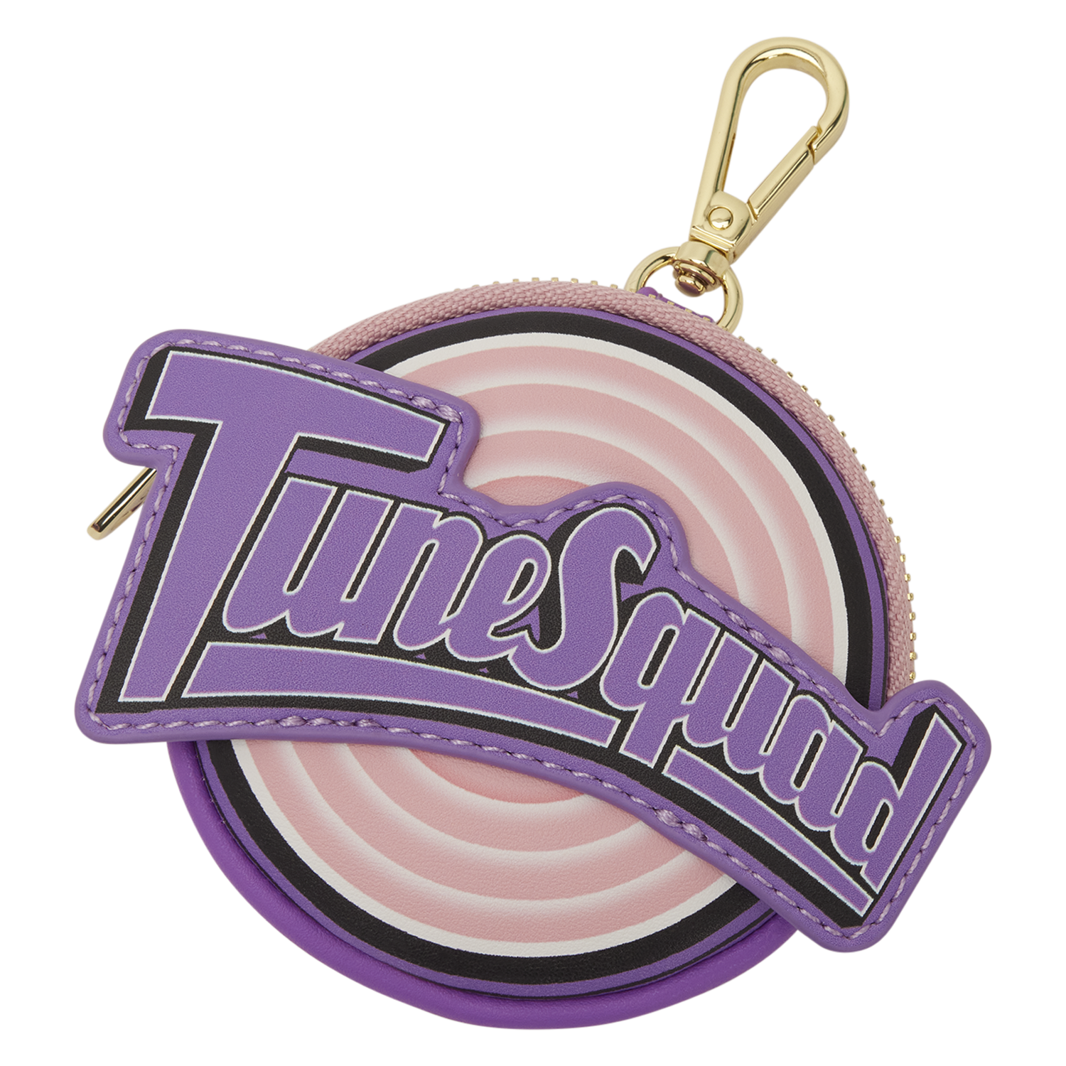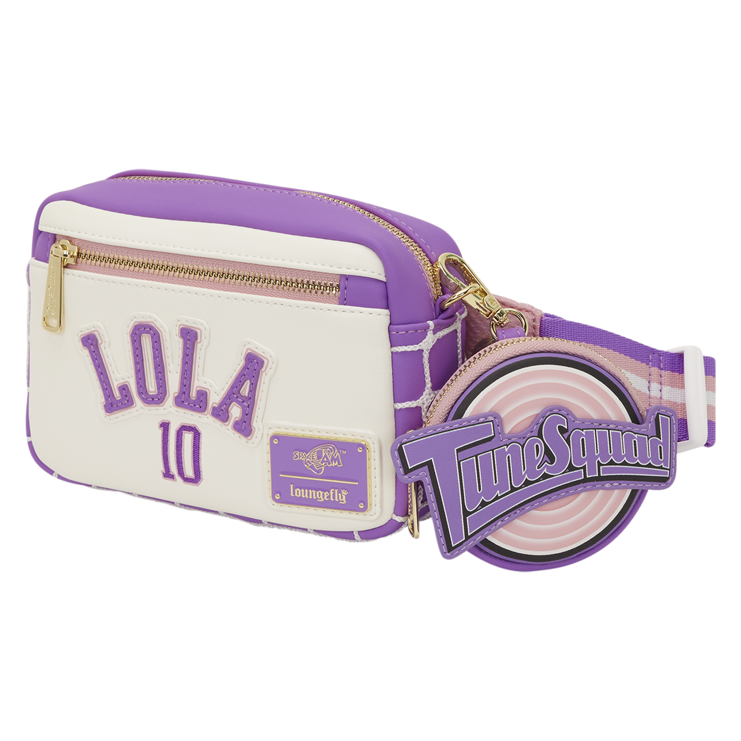 This sling is inspired by Lola Bunny. The front is white, the back is purple, and the crossbody strap features pink, white, and purple. On the front, you'll find "Lola" written above her number "10" in pink-and-purple lettering. Net material appears on the sides of the sling. Turn the sling around to find an image of Lola Bunny. There's also a coin bag attached to the crossbody strap that says "TuneSquad."