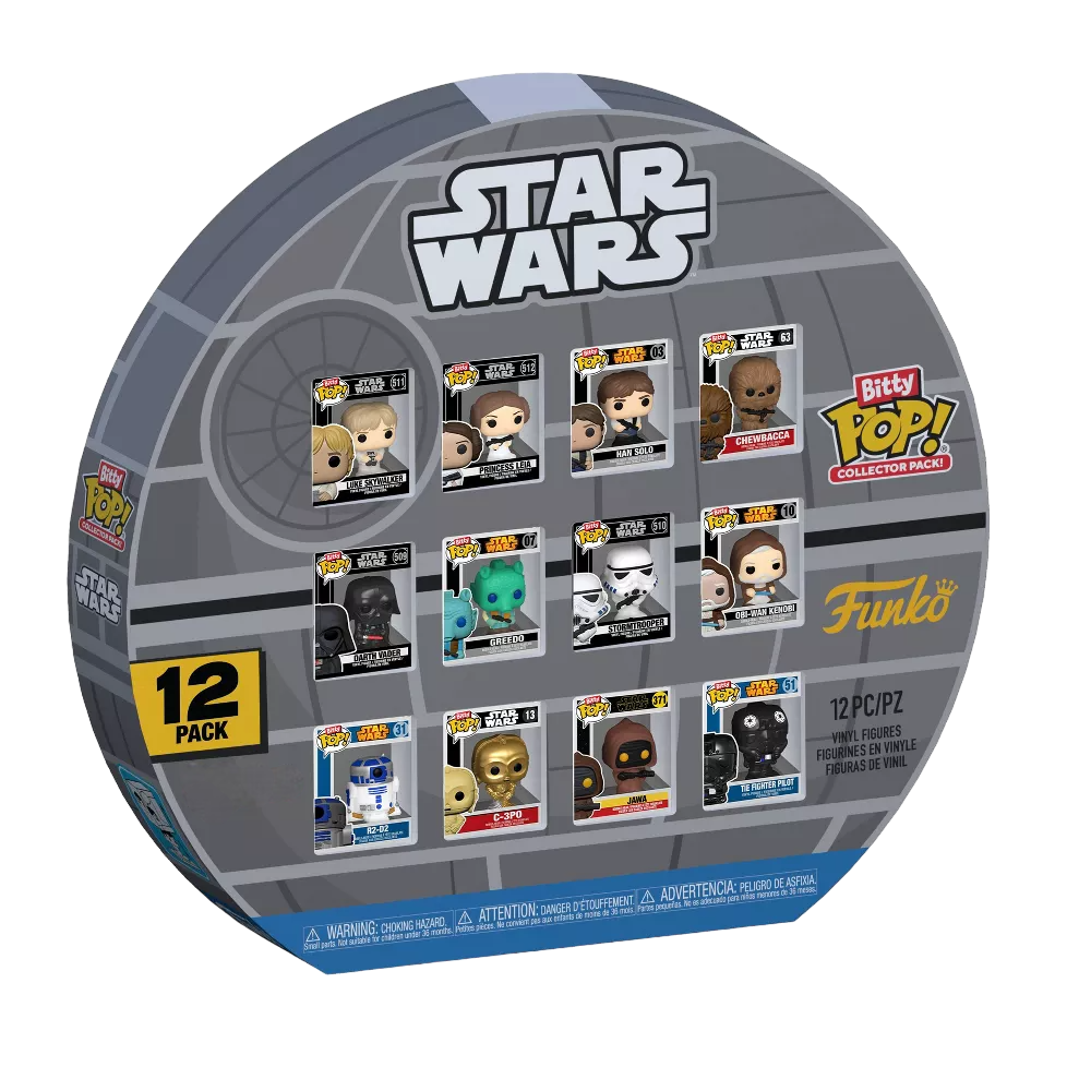 This exclusive 12-pack includes Bitty POP! Luke Skywalker™, Bitty POP! Princess Leia™, Bitty POP! Han Solo™, Bitty POP! Chewbacca™, Bitty POP! Darth Vader™, Bitty POP! Greedo™, Bitty POP! Stormtrooper™, Bitty POP! Obi-Wan Kenobi™, Bitty POP! R2-D2™, Bitty POP! C-3PO™, Bitty POP! Jawa™, and Bitty POP! TIE Fighter Pilot™. Bitty POP! collectibles are packaged in hard acrylic cases with detachable bottom lids.