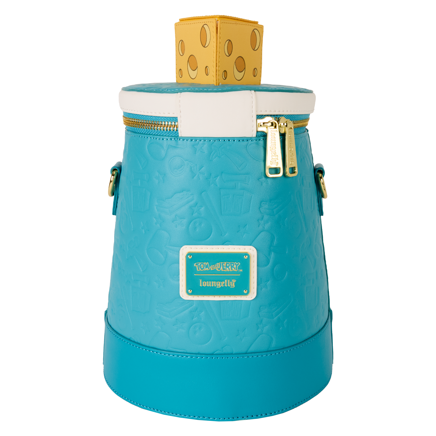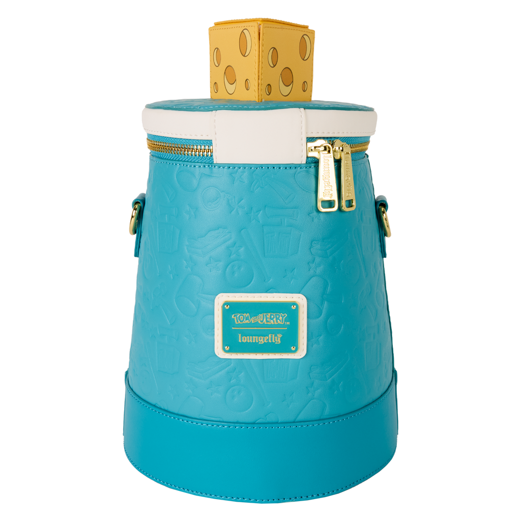 You'll find a panel that shows an image of Tom chasing Jerry on the front. You can spin the scene with a knob at the bottom so it changes to another scene! All over the rest of the bag, you'll find debossed motifs inspired by the show.
