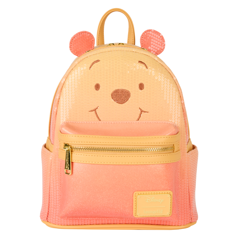 This mini backpack features Winnie the Pooh with embroidered facial details on the front and 3D applique ears. The bag is covered in sequins and the front pocket shines with glitter details. The colors transition from yellow to pink for an ombre effect!